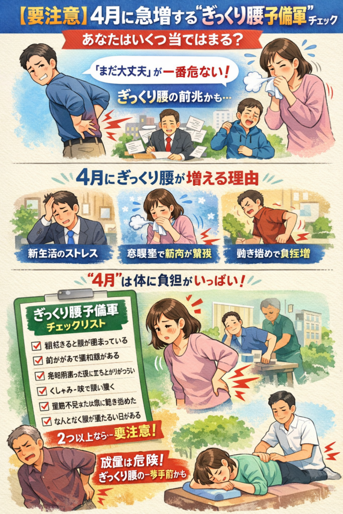 【要注意】4月に急増する“ぎっくり腰予備軍”チェック|あなたはいくつ当てはまる? 「まだ大丈夫」と思っていませんか? 朝、起き上がるときに腰が重い、くしゃみや咳で腰に違和感がある、長時間同じ姿勢のあとに動き出しがつらい…。そんな症状がある方は... -