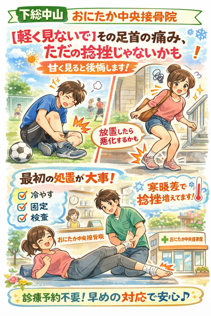 【下総中山で捻挫なら】その足首、本当に今のままで大丈夫?部活生が後悔する前に読むべき話 部活中に「グキッ」となった瞬間。 そのあと、こう思っていませんか? とりあえず歩けるから大丈夫 湿布貼っておけば平気 大会近いし休めない でも、はっきり言... -