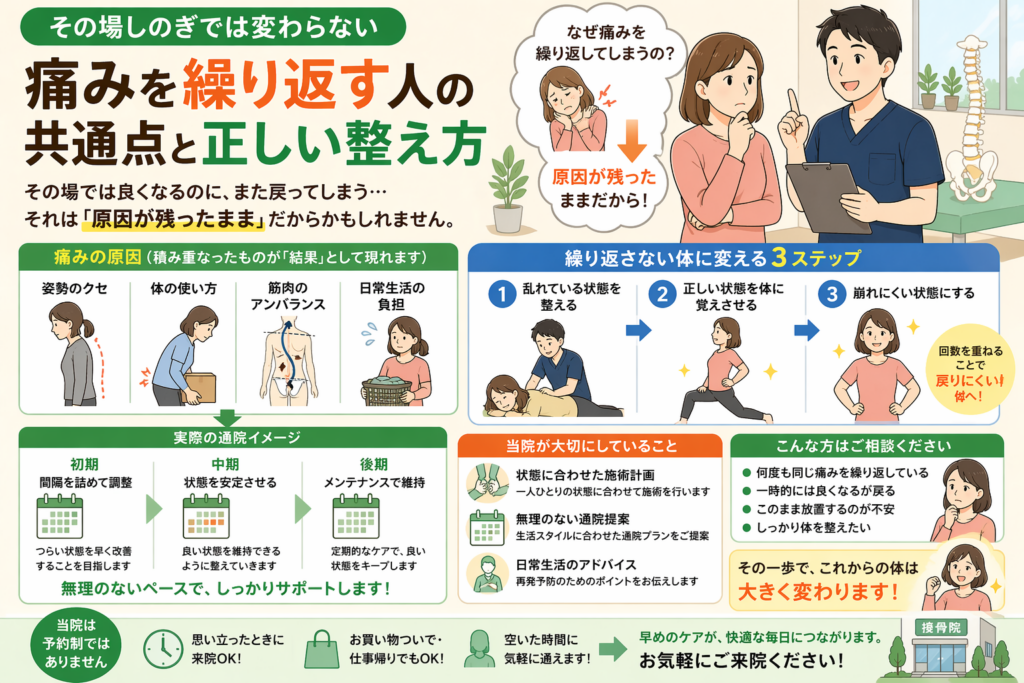 【初めての方へ】接骨院ってどんなことするの?不安な方にわかりやすく解説します 「接骨院って何をするところ?」と不安に思っていませんか? ・バキバキされるのが怖い・どんな施術をするのかわからない・自分の症状でも行っていいのか不安 初めての方か... -