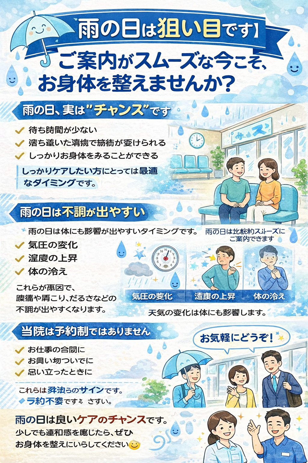 【雨の日は狙い目です】ご案内がスムーズな今こそ、お身体を整えませんか?